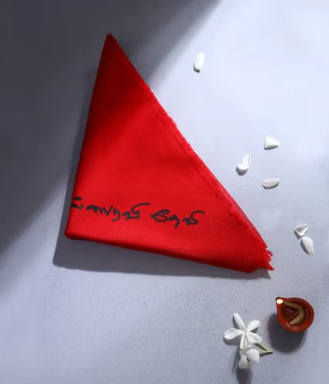 This consecrated cotton Devi Vastram, dyed in a fiery red (the colour of the Devi) features a calligraphic screen print that reads 'Jai Bhairavi Devi' in Tamil. You can keep it in your puja room or near the Gudi, living or working space to spread positive energy. You can also wear it as a bandana, or tie it in your vehicle to receive Devi's grace.