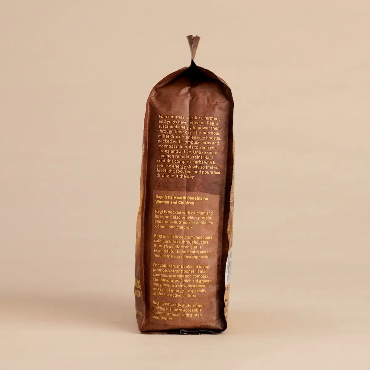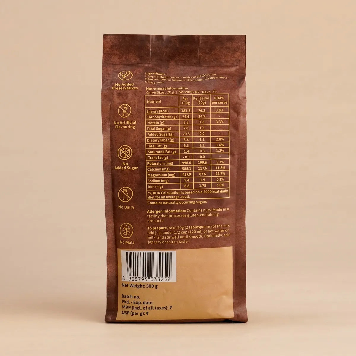An Ancient Superfood of Bharat, Ragi has nourished warriors, farmers, and yogis for centuries. Now, in its most beloved form, Ragi Huri Hittu (sprouted ragi flour) comes to you reimagined as a wholesome, clean and convenient drink mix crafted with roasted ragi, dates, nuts, and coconut. Rich in iron and a natural source of calcium, protein, and fiber, it provides steady energy and essential nutrition for the whole family. Unlike refined grains, ragi’s complex carbs release energy slowly, keeping you light, focused, and active through the day.